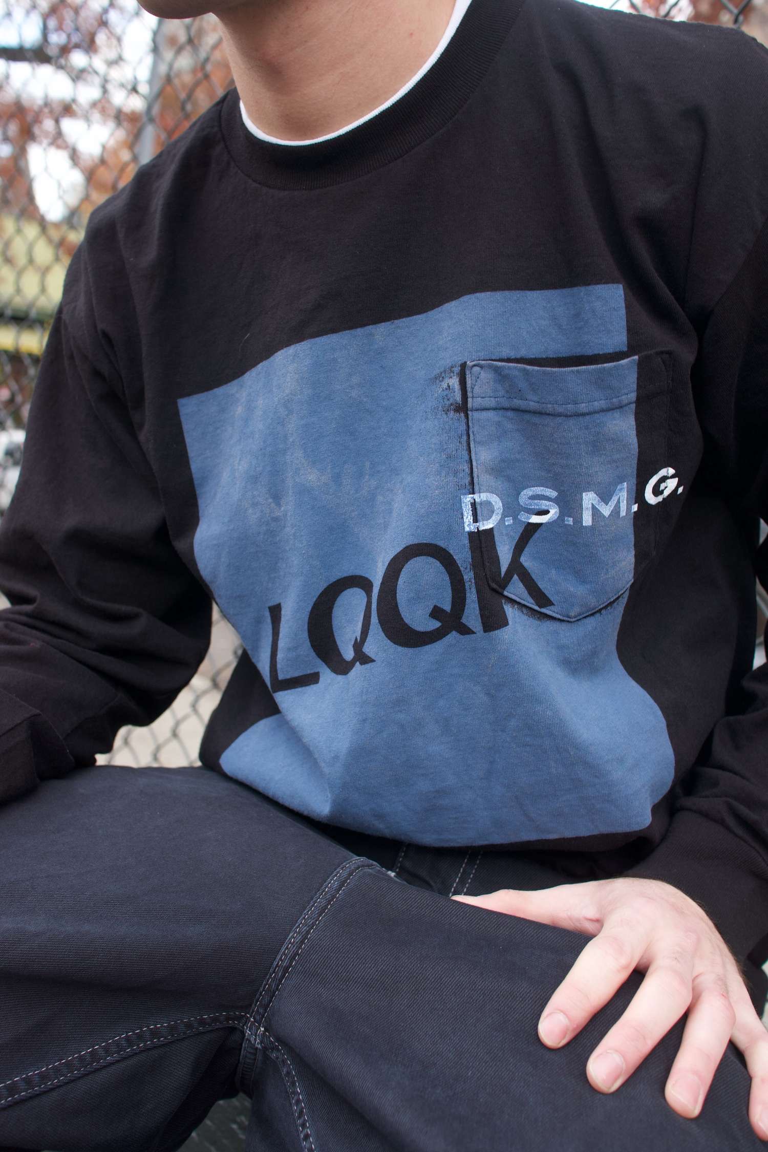 今回のアートワークは、LQQK Studio初期を象徴するスクエア×ポケットのミニマルな構成を継承しつつ、色面の再編集や質感のレイヤリングを行うことで、アーカイブと現行デザインを接続する“アップデート版”をDSMGエクスクルーシブアイテムとして制作。ブランドのプリント技術とコンセプトを象徴するビジュアルとなっている。