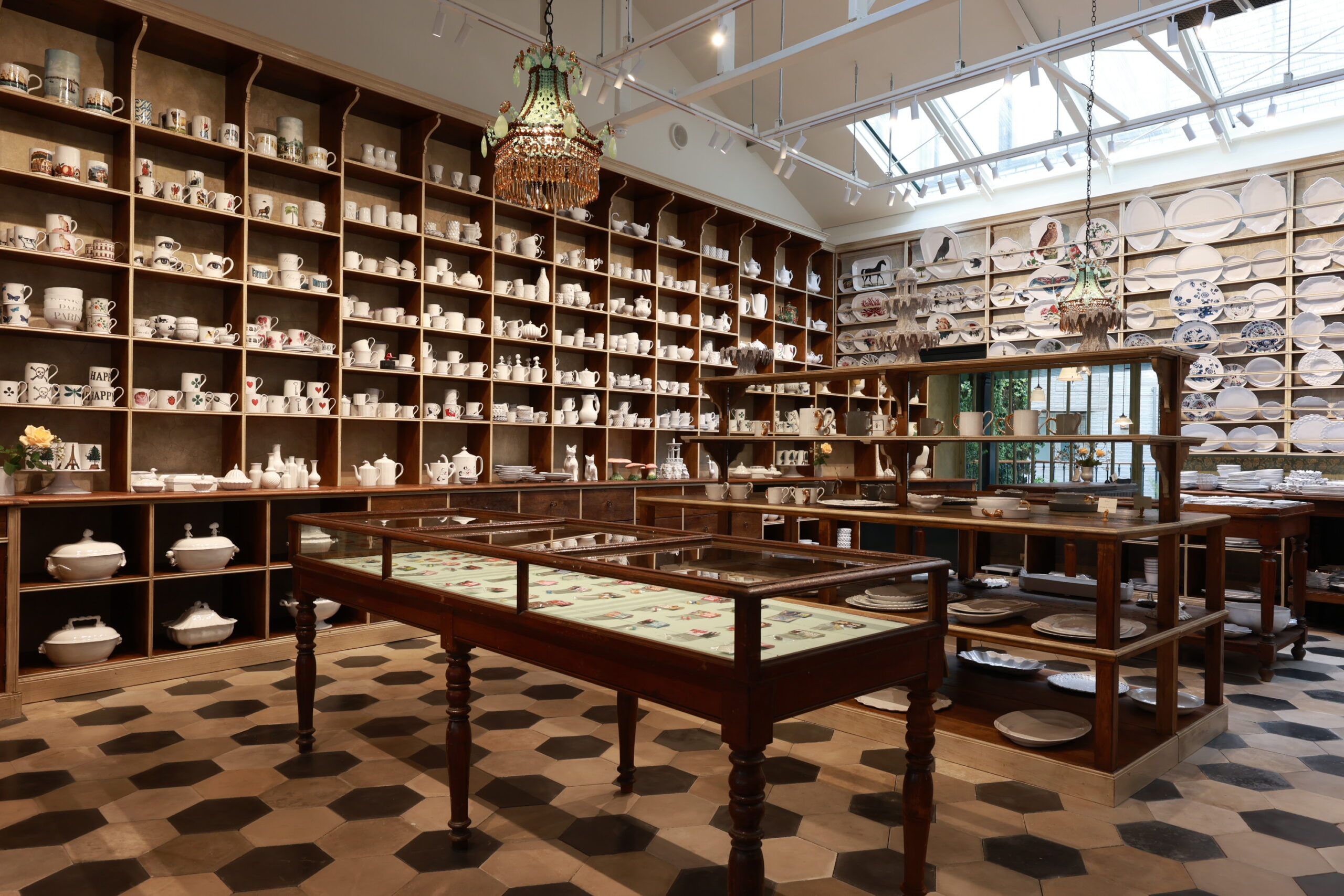 床から緑と金の花模様の壁が続き、大きなガラス窓で縁取られた空間の中、ラックは白い陶器の食器で埋め尽くされ、隣合わせの棚にはあらゆる種類の装飾品やリングカップ、キャンドルホルダー、ゴブレット、ピッチャーやお皿が溢れかえっています。