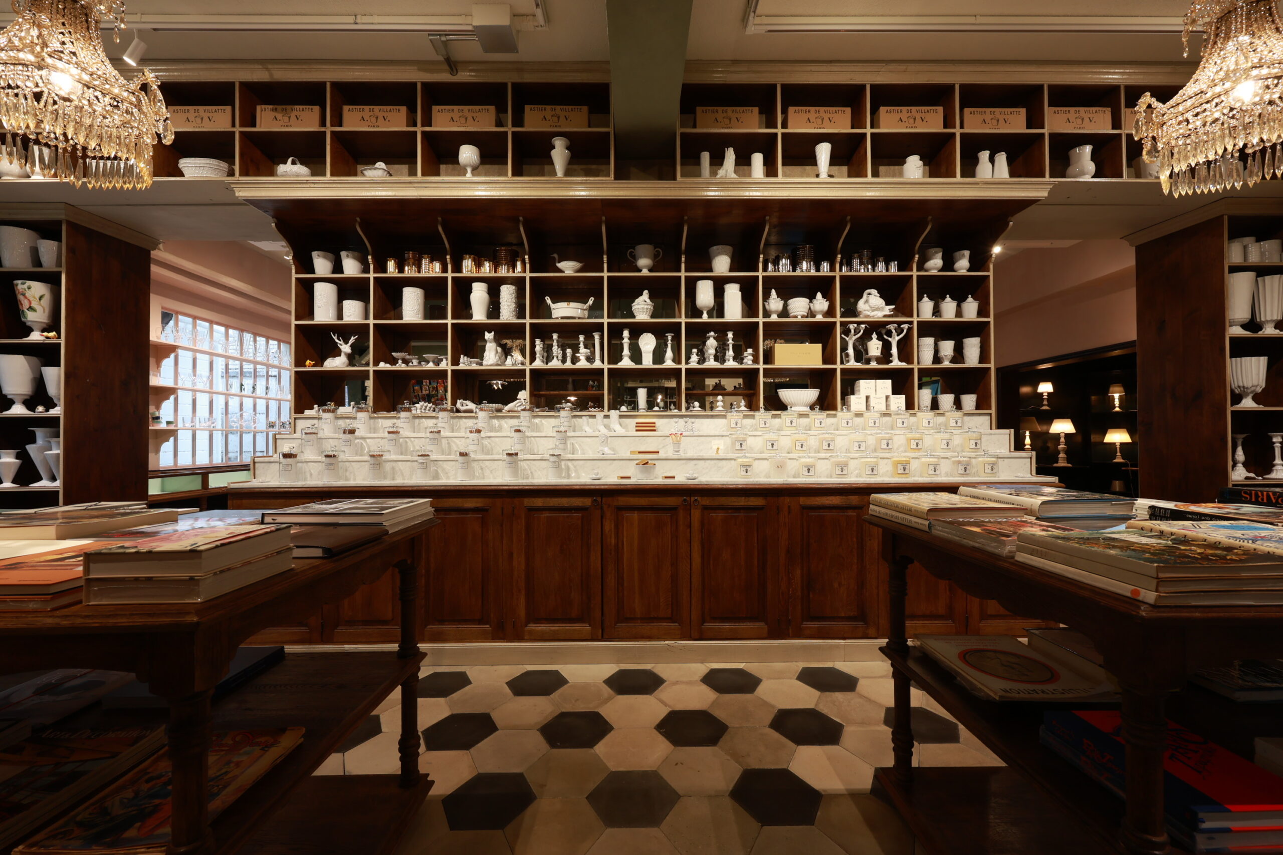 このスペースにはその他にも、驚くほど豊富な商品が世界中から届きます。ドイツからはハンドペイントを施した陶器製注ぎ口キャップ、シチリアからはトロンプルイユのキャンドル(ケーキ、パスタ、ハム、チーズ)やイタリア定番の直火式エスプレッソメーカーとカップ、私たちの願いをすべて叶えてくれるダナ・ワイズのピル袋(自分を愛せたり、上司と上手く付き合えたり、猫をセリーヌ・ディオンのように歌わせたり、過去を消し去ったり…)、アンケ・ドレクセル作の正方形または長方形のカラフルでチャーミングな金色フリンジ付ベロアクッションも。