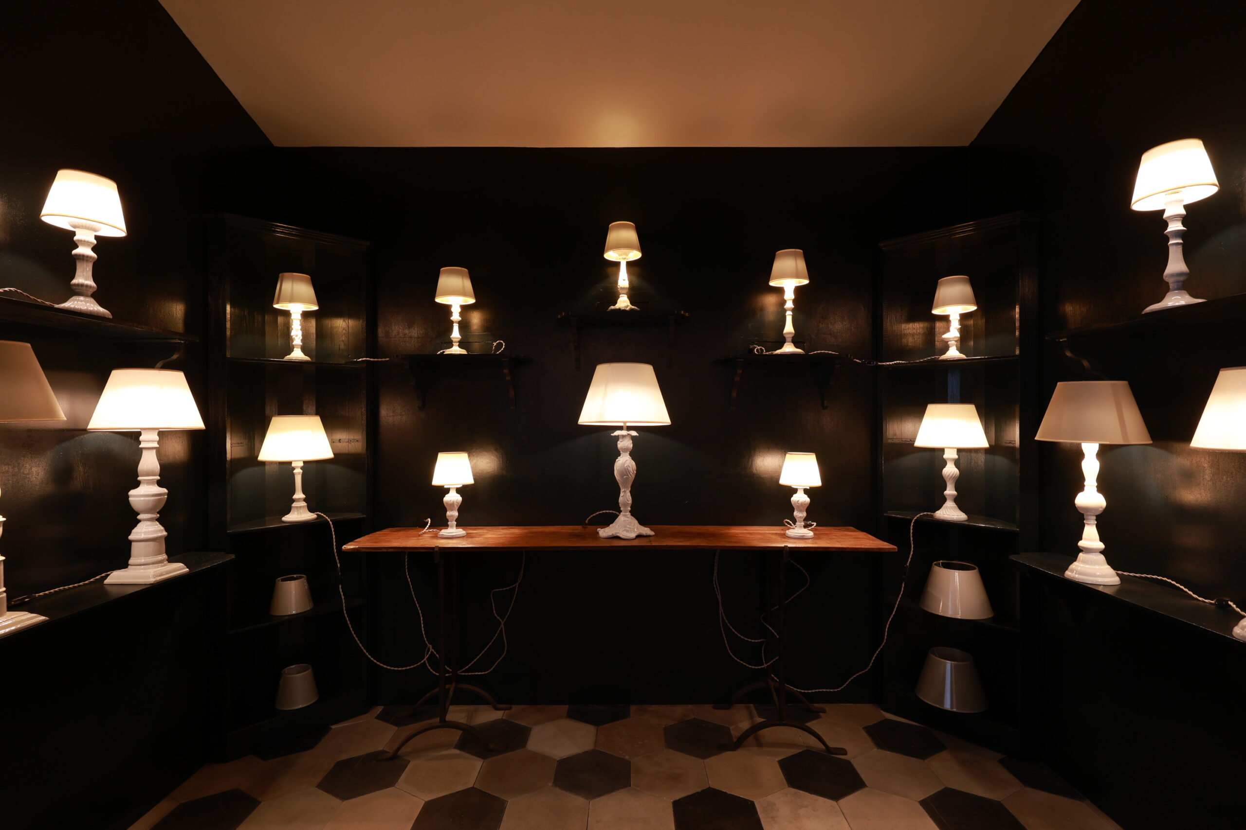 奥の小部屋には大小さまざまな形をした数十もの白い陶器製のランプが所狭しと並びます。