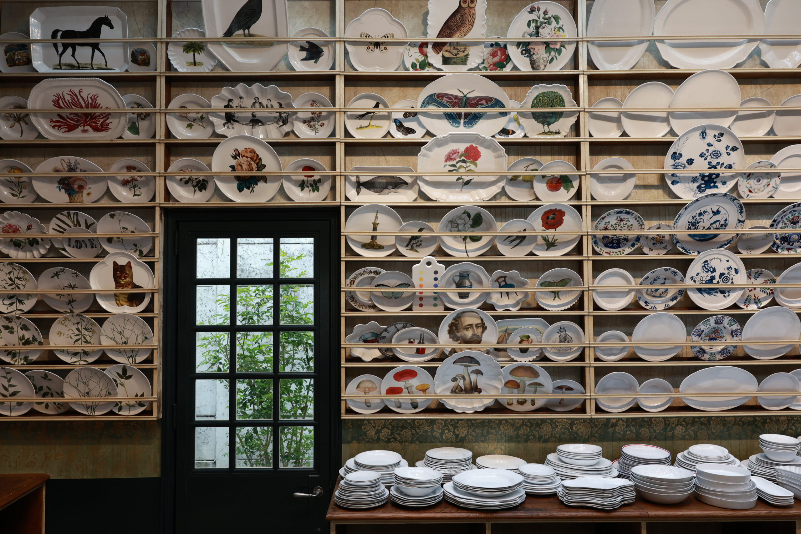 床から緑と金の花模様の壁が続き、大きなガラス窓で縁取られた空間の中、ラックは白い陶器の食器で埋め尽くされ、隣合わせの棚にはあらゆる種類の装飾品やリングカップ、キャンドルホルダー、ゴブレット、ピッチャーやお皿が溢れかえっています。